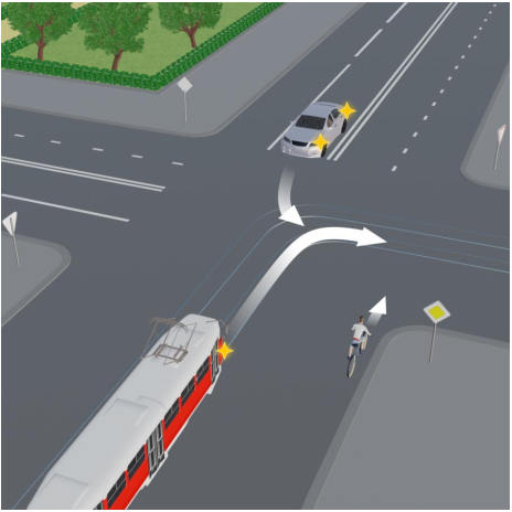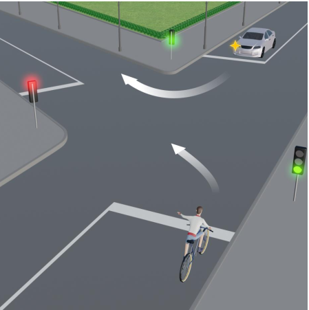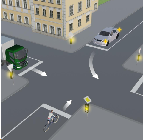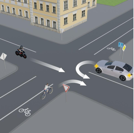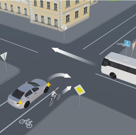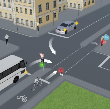- велосипедист (после включения разрешающего сигнала светофора с символом велосипеда), автобус, легковой автомобиль