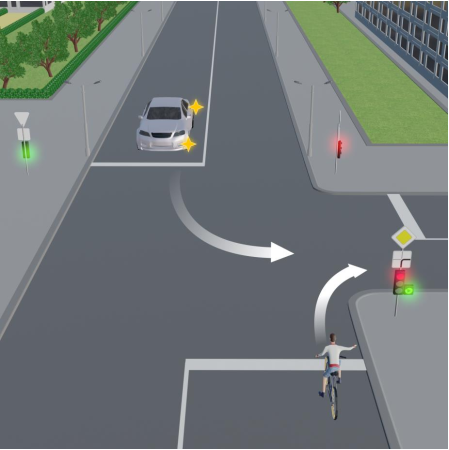- автобус, легковой автомобиль, а после включения разрешающего сигнала светофора с символом велосипеда – велосипедист