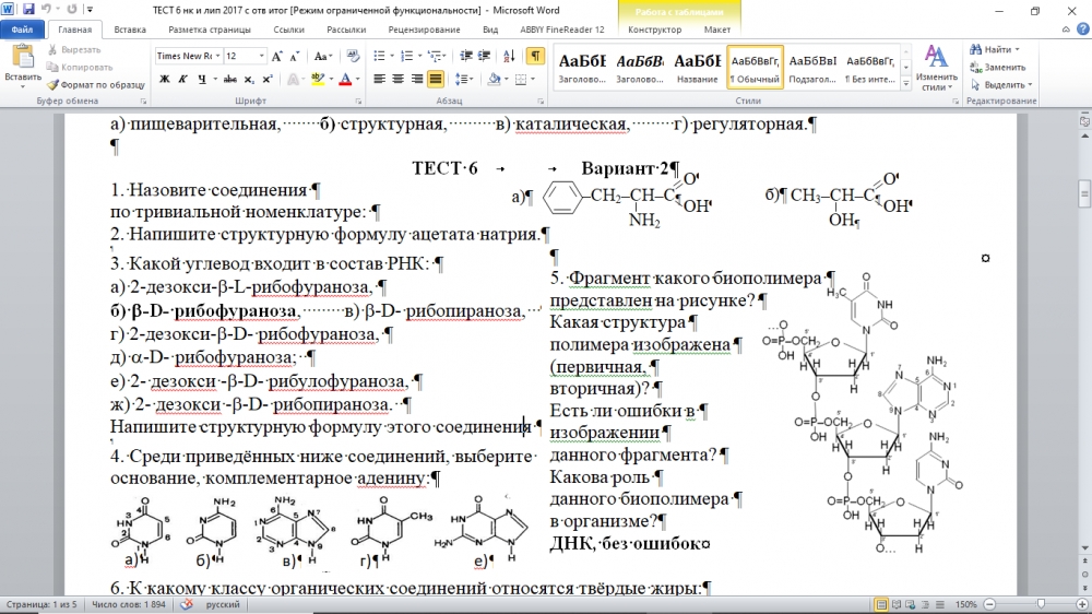 Тест по теме "Липиды" для студентов 1 курса специальности "Лечебное дело"