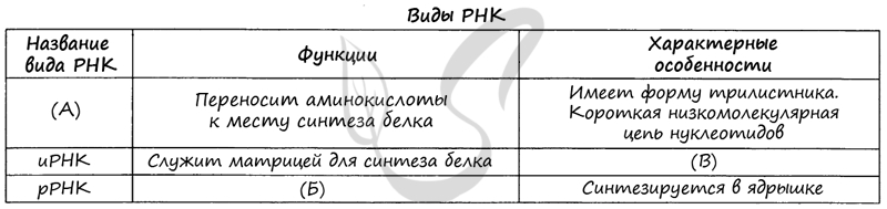 Проанализируйте таблицу: «Виды РНК». Заполните пустые ячейки таблицы, используя термины, приведенные в списке. Для каждой ячейки, обозначенной буквами, выберите соответствующий термин из предложенного списка. 1) комплементарна участку молекулы ДНК, несущему информацию о первичной структуре одного белка