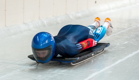 - Спортсмены скользят вниз по ледяной трассе на специальных санях.