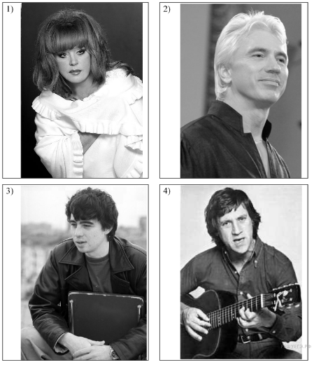 На какой из фотографий, представленных ниже, изображены деятели культуры, которые были наиболее популярны в период подготовки и проведения Олимпийских игр, символика которых представлена выше? В ответе запишите две цифры, под которыми они указаны.
