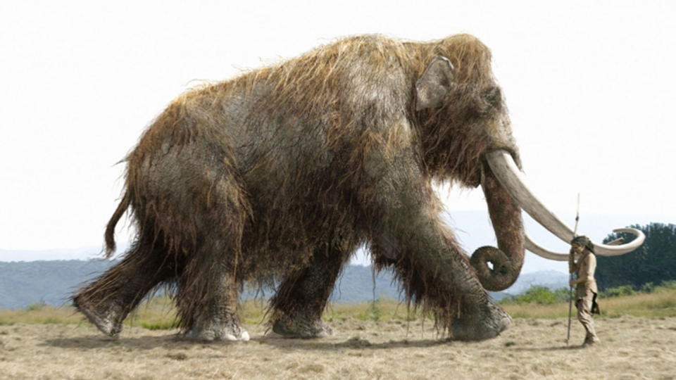 Огромный слон, покрытый шерстью, с сильно изогнутыми бивнями.