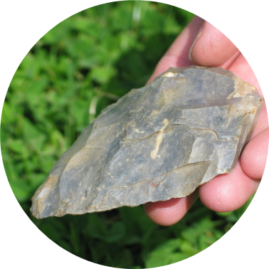 Это камень округлой формы, обработанный сколами с двух сторон. В основании, там, где рукоятка, он утолщённый и закруглённый, на ударном конце - заострённый.