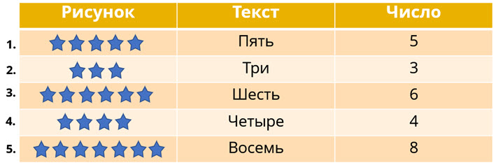 - Информацию о количестве предметов, порядковый номер предмета можно обозначить числом или текстом.