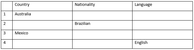 - a) Australia - Australian - English b) Brasilia - Brazilian - Portuguese c) Mexico - Mexican - Spanish d) The USA - American - English