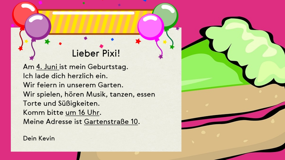 Wir (1)______ den Garten mit Ballons und Luftschlangen. Wir (2)______ Würstchen. Wir (3)______ eine leckere Torte. Dann (4)______ wir den Tisch.