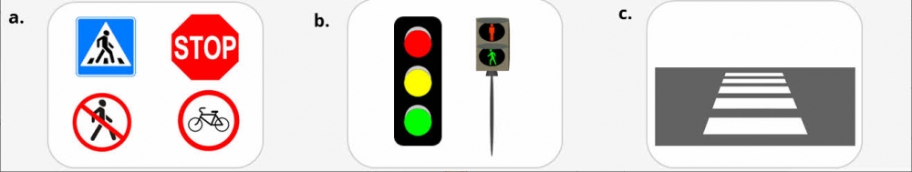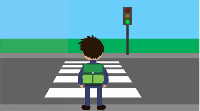 Der Junge muss die Straße mit Verkehrsampel überqueren. Es leuchtet grüne Licht. Was muss er machen?