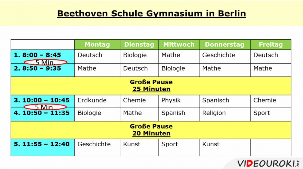 - Nach der dritten Stunde gibt es eine 5-Minuten Pause.