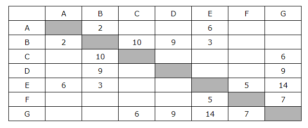 Между населёнными пунктами A, B, C, D, E, F, G построены дороги, протяжённость которых приведена в таблице. Отсутствие числа в таблице означает, что прямой дороги между пунктами нет.