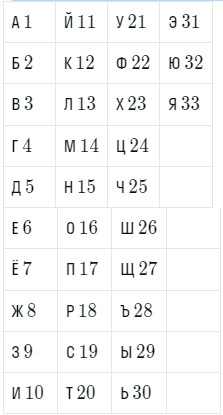 А - 1, Б - 2, В - 3, Г- 4, Д - 5, Е - 6, Ё - 7, Ж -8, З - 9, И - 10, Й - 11, К - 12, Л - 13, М - 14, Н - 15, О - 16. П - 17, Р - 18, С - 19, Т - 20, У - 21, Ф - 22, Х -23, Ц - 24, Ч - 25, Ш - 26, Щ- 27, Ъ - 28, Ы - 29, Ь - 30, Э - 31, Ю - 32, Я - 33