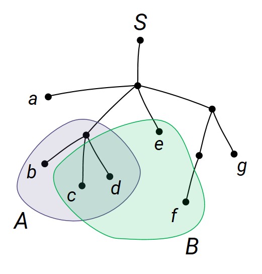 На рисунке изображено дерево случайного эксперимента с начальной вершиной S. События А и B показаны закрашенными фигурами. Сколько элементарных событий эксперимента благоприятствуют событию А?