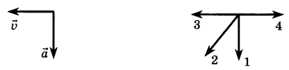 На левом рисунке представлены векторы скорости и ускорения тела. Какой из четырех векторов на правом рисунке указывает направление вектора равнодействующей всех сил, действующих на это тело?
