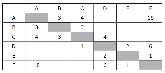 Между населёнными пунктами A, B, C, D, E, F построены дороги, протяжённость которых в (километрах) приведена в таблице.