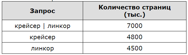 Сколько страниц (в тыс.) будет найдено по запросу крейсер & линкор