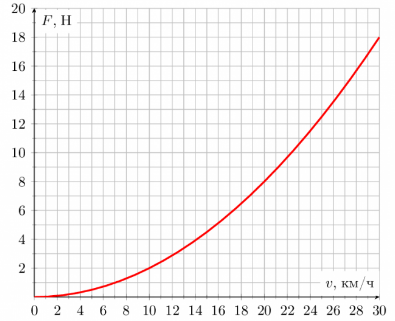 Мальчик Игорь на мопеде совершил два заезда в течение дня. В первый раз, в безветренную погоду, он ехал со скоростью 20 км/ч. Во время второго заезда дул встречный ветер, и мальчик смог развить скорость лишь 15 км/ч. График зависимости силы сопротивления воздуха от скорости мальчика (в отсутствие ветра) приведён на рисунке. Найдите скорость ветра во время второго заезда. Колеса мопеда не проскальзывают, трением в осях пренебречь. Считайте, что мощность двигателя одинакова во всех заездах.