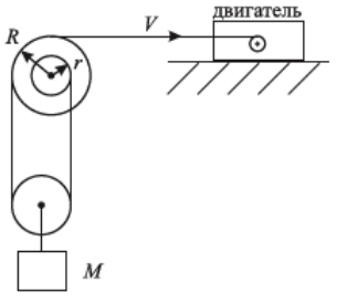 Экспериментатор Глюк решил сделать двигатель для подъема грузов. Вся установка состоит из двигателя, блоков и груза массой М = 10 кг, который крепится к подвижному блоку, подвешенному на нити, один из концов которой намотан на шкив, радиус r ㅤ которого в два раза меньше шкива радиуса R, а другой конец перекинут через соосный, скреплённый с первым шкив радиусом R=0,4 м и наматывается на вал, приводимый во вращение при помощи двигателя (см. рисунок). Скорость участка нити, показанного на рисунке равна V=1 м/с. Найдите мощность в Ваттах, которая развивается двигателем при поднятии груза. Считайте, что трение между блоком и нитью достаточное для того, чтобы нить не проскальзывала.