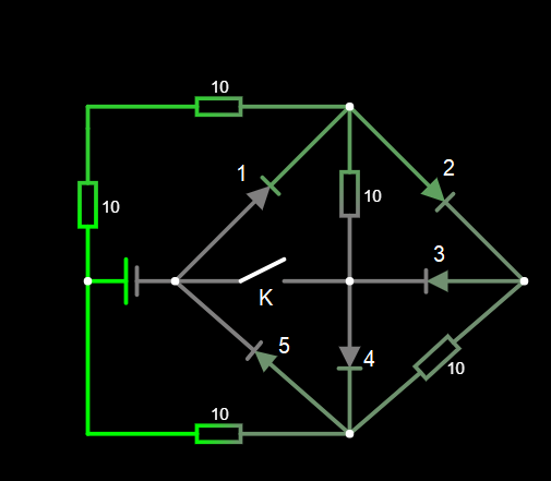 Схема состоящая из источника напряжения, резисторов и идеальных диодов показана на рисунке. В схеме также имеется ключ, который первоначально разомкнут. Цифры рядом с диодами обозначают их номера. Определите через какие диоды будет течь ток, если ключ К замкунть. В ответ запишите их номера без пробела, начиная с наименьшего по номеру в порядке возрастания в формате 12345.