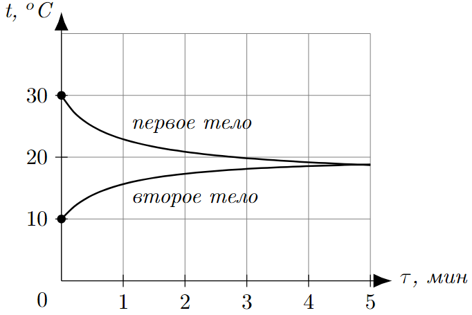 Два тела равной массы привели в контакт и поместили в теплоизолированную емкость. График зависимости их температур от времени представлен на рисунке.