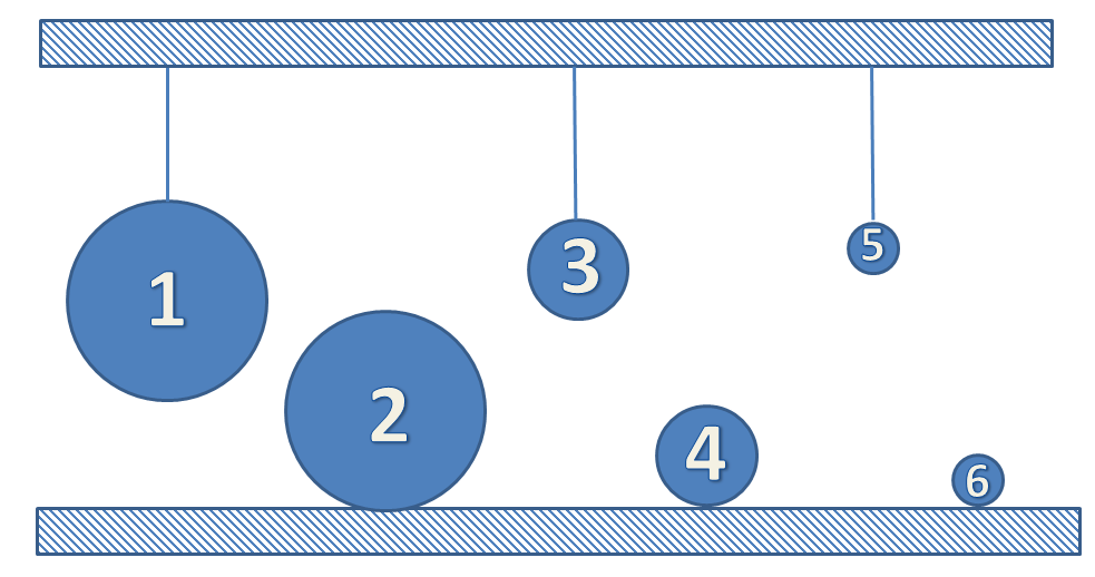 Шесть резиновых шаров имеют разные размеры: пятый и шестой радиус R, третий и четвертый радиус 2R, первый и второй радиус 4R. Каждому шару сообщили одинаковое количесвто теплоты равное Q=500 Дж. Сравните установившиеся температуры шаров. Шары с нечетными номерами висят на непроводящих тепло нитях, а с четными лежат на непроводящей тепло поверхности. Любыми теплопотерями пренебречь.