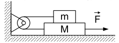 Массивный брусок положили на горизонтальную поверхность. Сверху на него положили брусок меньшей массы, а затем бруски соединили при помощи невесомой нити, которую перебросили через легкий блок (см. рис.). Нижний брусок имеет массу \(M=\ 2\ кг\), а верхний \(m=\ 1\ кг\). Коэффициент трения между верних бруском и нижним равен 0,5. А между нижним и поверхностью 0,2.