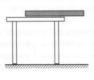 На столе лежит однородная доска массой m = 5 кг, которая свисает со стола на треть своей длины (см. рисунок). Какую минимальную силу надо приложить к свисающему концу доски, чтобы ее противоположный конец оторвался от стола?