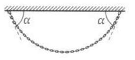 Цепочка массы 500 грамм подвешена за концы так, что вблизи точек подвеса она образует с горизонтом угол α = 15° (см. рисунок). Определите силы натяжения цепочки около точек крепления. Ответ выразить в ньютонах и округлить до целого числа.