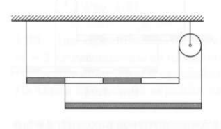 Система, изображенная на рисунке, состоящая из однородных стержней, трех нитей и блока, находится в равновесии. Все нити вертикальны. Масса верхнего стержня \(m_1\) = 3 кг. Найдите массу \(m_2\) нижнего стержня. Ответ дать в килограммах.