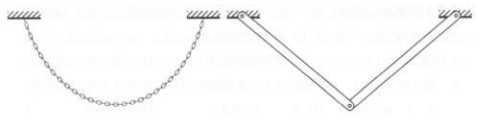 К находящимся на одном уровне точкам подвешена однородная цепочка и конструкция из двух шарнирно скрепленных однородных стержней (см. рисунок). Массы и общие длины обеих систем равны. У какой из систем центр тяжести расположен ниже?