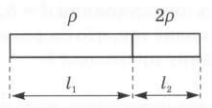 Стержень, изображенный на рисунке, спаян из двух одинаковых по сечению стержней, изготовленных из материалов с плот- ностями \(\rho\) и \(2\rho\). При каком отношении длин стержней \(l_1\) /\(l_2\) центр тяжести системы будет находиться в плоскости спая? Ответ округлить до десятых.