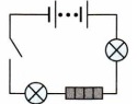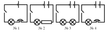 В электрическую цепь включены: электрическая лампа, ключ, резистор и источник тока – батарея гальванических элементов. На каком из рисунков изображена схема описанной выше электрической цепи?