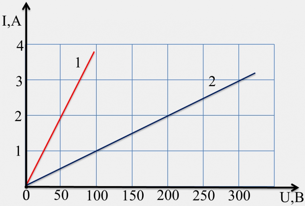 На рисунке показаны графики зависимости силы тока от напряжения для разных резисторов. С их помощью определите сопротивление каждого из резисторов с точностью до 5 Ом