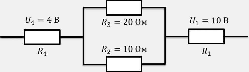 На рисунке указан участок цепи. Исходя из данных на рисунке, найдите силу тока (в А) в резисторе R4. Известно, что напряжение во всей цепи равно 20 В и что никаких других элементов, кроме источника тока в цепи нет.