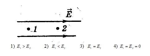 Положительный заряд перемещается в однородном электростатическом поле из точки 1 в точку 2 по разным траекториям. При перемещении по какой траектории электрическое поле совершает наименьшую работу?
