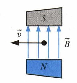 Частица, отрицательно заряженная, имеет горизонтально направленную скорость, влетает в область поля перпендикулярно вектору индукции магнитного поля. Куда направлена сила, действующая на частицу?