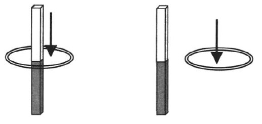 Один раз кольцо падает на стоящий вертикально полосовой магнит так, что надевается на него; второй раз так, что пролетает мимо него. Плоскость кольца в обоих случаях горизонтальна.
