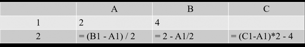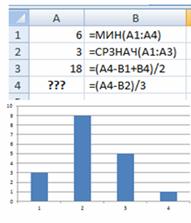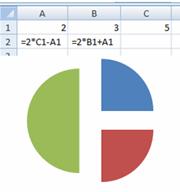 Дан фрагмент электронной таблицы в режиме отображения формул. Какая формула может быть записана в ячейке С2, чтобы построенная после выполнения вычислений диаграмма диапазона ячеек А2:С2 соответствовала рисунку?