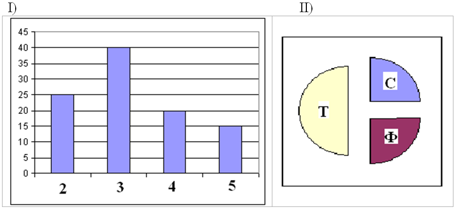 В цехе трудятся рабочие трех специальностей – токари (Т), слесари (С) и фрезеровщики (Ф). Каждый рабочий имеет разряд не меньший второго и не больший пятого. На диаграмме I отражено количество рабочих с различными разрядами, а на диаграмме II – распределение рабочих по специальностям. Каждый рабочий имеет только одну специальность и один разряд.