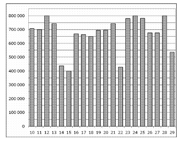 На диаграмме показано количество посетителей сайта РИА Новости во все дни с 10 по 29 ноября 2009 года. По горизонтали указываются дни месяца, по вертикали — количество посетителей сайта за данный день. Определите по диаграмме, каково наибольшее суточное количество посетителей сайта РИА Новости за указанный период.