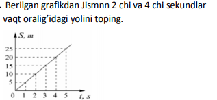 Berilgan grafikdan Jismnn 2 chi va 4 chi sekundlar vaqt oralig’idagi yolini toping.