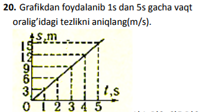 Grafikdan foydalanib 1s dan 5s gacha vaqt oralig’idagi tezlikni aniqlang(m/s).