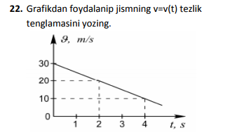 Grafikdan foydalanip jismning v=v(t) tezlik tenglamasini yozing.