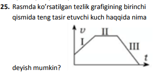 Rasmda ko’rsatilgan tezlik grafigining birinchi qismida teng tasir etuvchi kuch haqqida nima deyish mumkin?