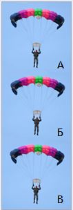 Парашютист равномерно опускается из положения А в положение В через положение Б. В какой из точек траектории кинетическая энергия парашютиста имеет наибольшее значение?