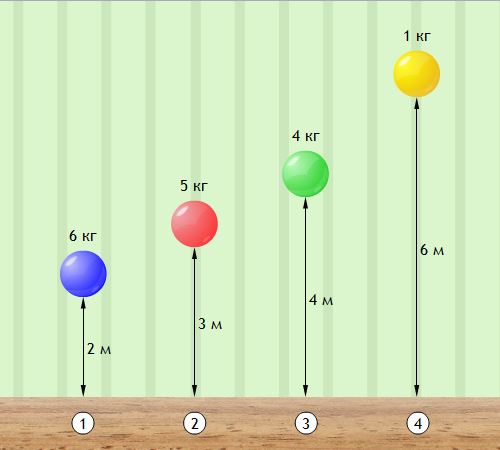 На рисунке представлены положения четырёх тел с различными массами на разных расстояниях от поверхности земли. Какое из этих тел имеет наибольшую потенциальную энергию? Коэффициент g = 10 Н/кг.