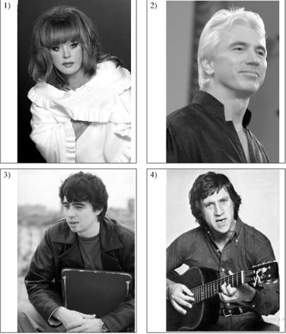 Анализ иллюстративного материала. На какой из фотографий, представленных ниже, изображены деятели культуры, которые были наиболее популярны в период подготовки и проведения Олимпийских игр, символика которых представлена выше?