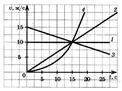 На рисунке изображены графики зависимости модуля скорости движения четырех автомобилей от времени. Какой из автомобилей — 1, 2, 3 или 4 — прошел наибольший путь за первые 15 с движения?