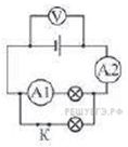 Электрическая цепь состоит из источника ЭДС с некоторым внутренним сопротивлением, двух одинаковых лампочек, ключа, вольтметра и двух амперметров (см. рисунок). Измерительные приборы можно считать идеальными. Как изменятся показания приборов, если разомкнуть ключ? Для каждой величины определите соответствующий характер изменения: