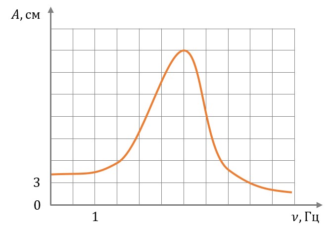 На рисунке изображена зависимость амплитуды установившихся колебаний маятника от частоты вынуждающей силы (резонансная кривая). Определите резонансную частоту и амплитуду колебаний этого маятника при резонансе.