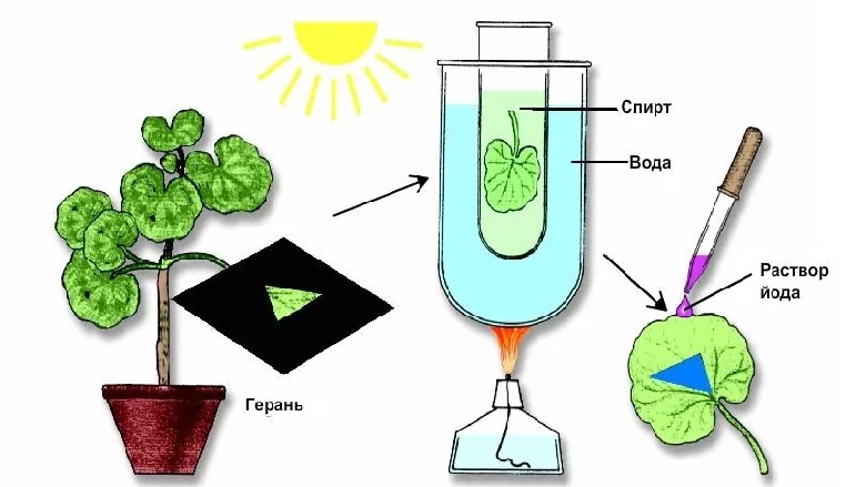 На рисунке изображен опыт, доказывающий, что образование крахмала происходит при фотосинт